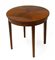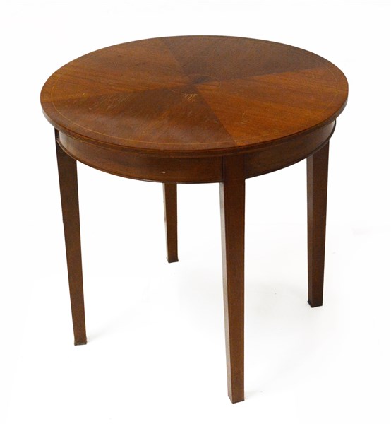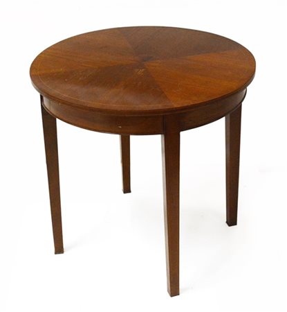 Tavolino tondo con piano a fascia lastonati e filettati, quattro gambe rastrema