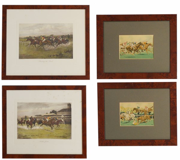 Lotto di due coppie di stampe a colori inerenti le corse a cavallo, misure dverse, in cornici (difetti)