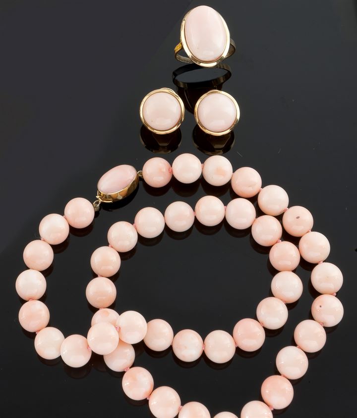 Demi-parure composta da una collana, una coppia di orecchini ed un anello in corallo rosa ed oro giallo