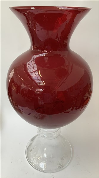 Grande vaso in vetro rosso con base incolore. Etichetta adesiva alla base "VG N
