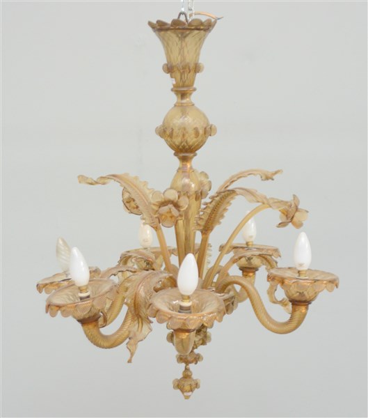 Manifattura di Murano del secolo XX, lampadario a sei luci in vetro ambrato (h