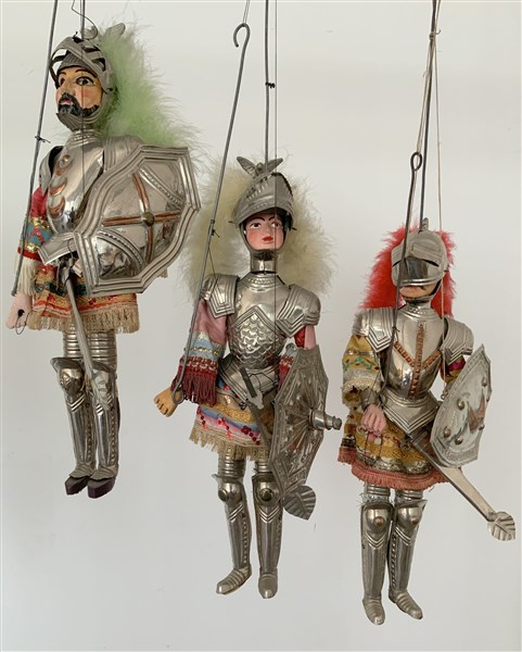 Gruppo di tre pupi siciliani raffiguranti i paladini Cloridano, Gandellino e Or