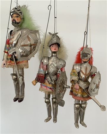 Gruppo di tre pupi siciliani raffiguranti i paladini Cloridano, Gandellino e Orloforte. Armature in metallo, tessuto, paillettes e piume. Manifattura palermitana Monteleone (h cm 48) (difetti e mancanze)