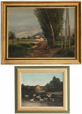 Lotto di due dipinti ad olio raffiguranti "Paesaggio fluviale con anatre" (cm 40x50) e "Campagna piemontese" (cm 60x80) autori diversi. In cornici