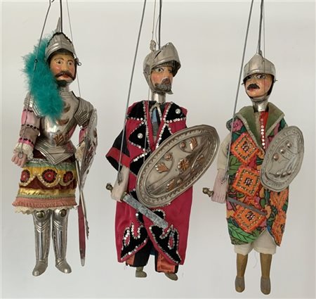 Gruppo di tre pupi siciliani raffiguranti un paladino e due pagani. Armature in metallo, tessuto, paillettes e piume. Manifattura palermitana Monteleone (h cm 48) (difetti e mancanze)