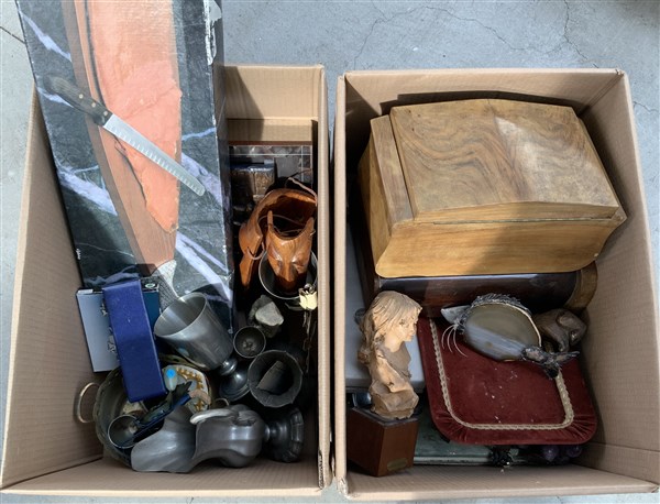 Lotto di due cartoni contenenti numerosi oggetti di materiali e per usi differenti (difetti)