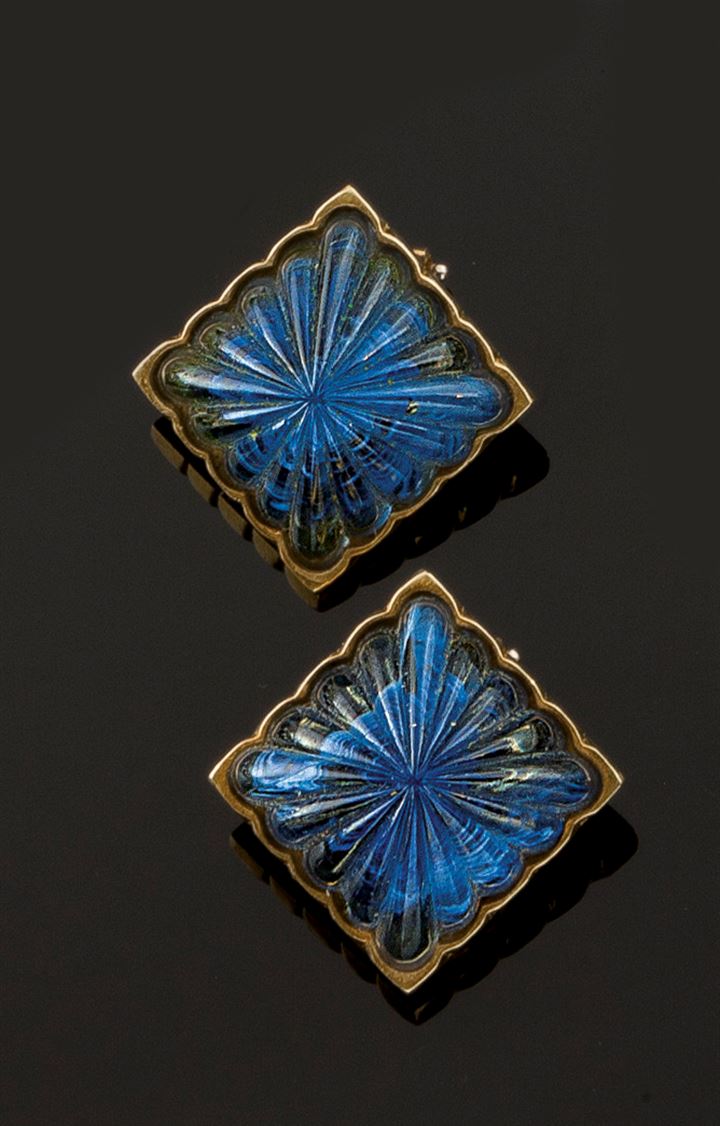 Coppia di orecchini in oro giallo, a clips, con due a zaffiri taglio cabochon incisi a piramide