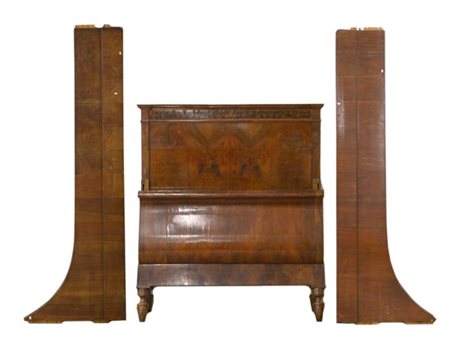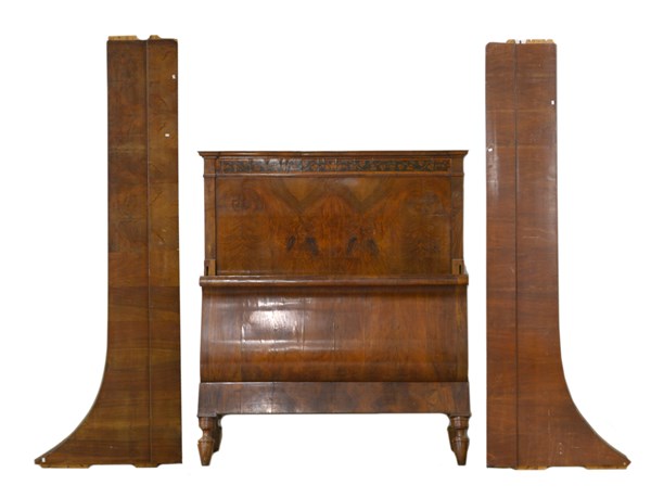 Letto ad una piazza lastronato in noce e radica di noce, testata decorata nella