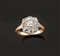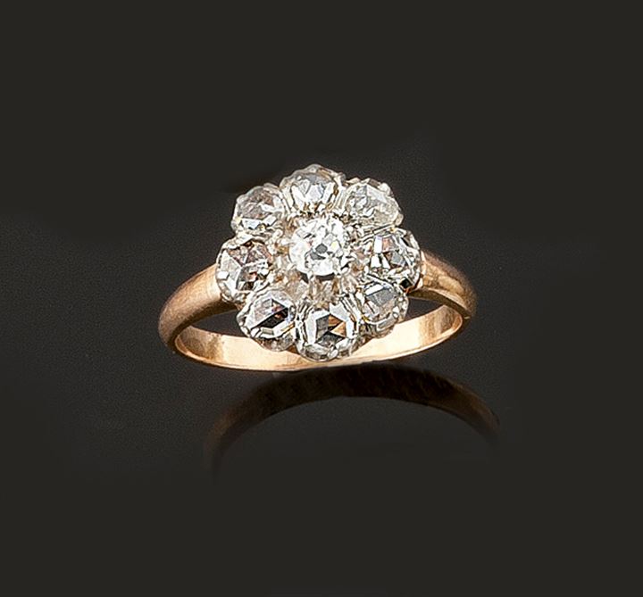 Anello in oro giallo e bianco, sommità a forma di fiore con al centro diamante taglio brillante di vecchio
