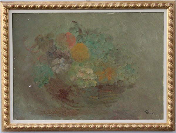 Firma indecifrata "Cesta di frutta" olio su tela (cm 48x70) Firmato in basso a