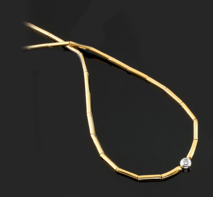 Girocollo in oro giallo composto da segmenti lucidi, nella parte centrale diamante taglio brillante