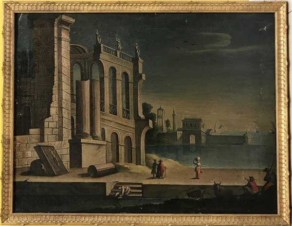Ignoto dell'inizio del secolo XIX "Capriccio architettonico con figure" olio su