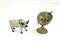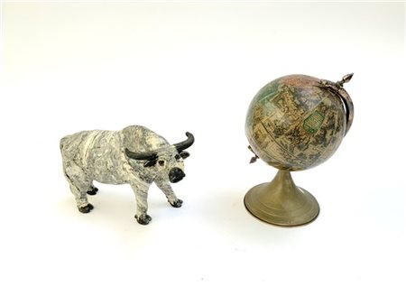 Lotto composto da un piccolo mappamondo da tavolo (h cm 21) ed un bue in cartapesta (difetti)