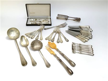 Cartone contenente un servizio di posate da dolce marcato Christofle con dodici forchette e coltelli, un servizio di posate per bambino in custodia e sei posate a servire in argento, epoche differenti (g 600 circa) (difetti)