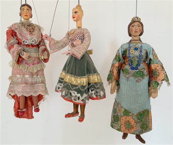 Gruppo di tre pupi siciliani raffiguranti dame della Reggia di Carlo Magno. Tes