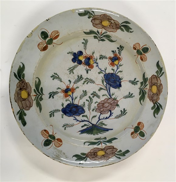 Antico piatto in maiolica decorato a motivi floreali (d cm 31) (difetti e resta