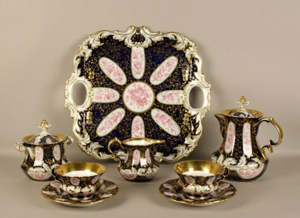 Firmato. Servizio da caffè per due persone composto da sei pezzi in porcellana decorata a motivi floreali. Marcato F-B. XX secolo. Difetti.