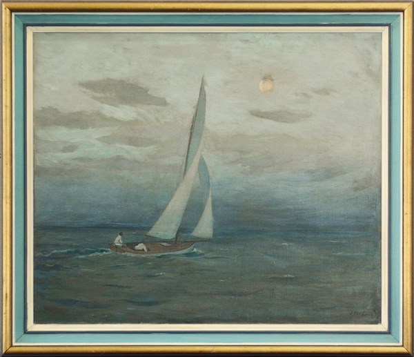 Ernst Gerhard "Marina con barca a vela" olio su tela (cm 57x68) Firmato in basso