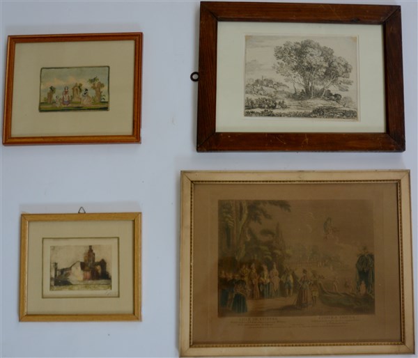Lotto composto da due incisioni raffiguranti una un paesaggio bucolico, l'altra una scena mitologica, un'acquaforte firmata ed un piccolo ricamo in cornice, misure divese (max cm 30x40) (difetti)