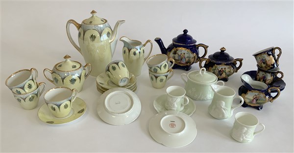 Lotto composto da parti di servizi per caffè in porcellana a decori floreali su fondo chiaro marcati Ginori, e con decoro a figure galanti su fondo blu di manifattura tedesca (difetti)