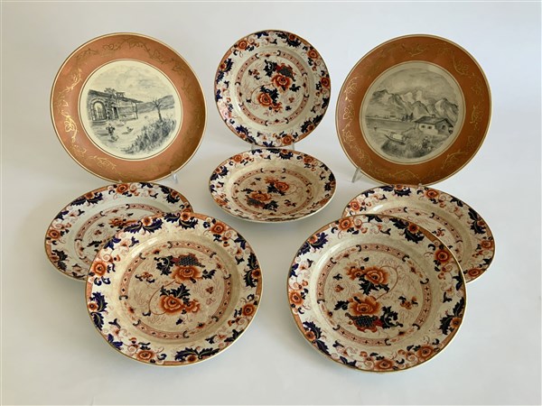 Lotto composto da sei piatti inglesi del secolo XIX a decoro floreale, manifattura Bentick, e una coppia di piatti decorati con paesaggi monocromi marcati Società Ceramica Laveno (d cm 20 e 23,5) (difetti)