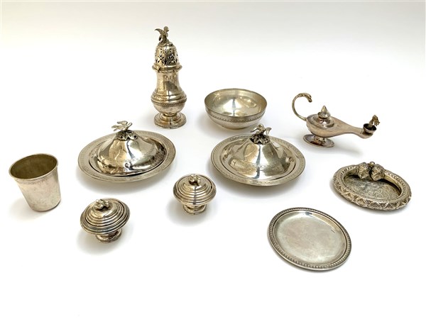 Lotto di dieci oggetti in argento di fatture differenti (g 950 circa) (difetti)