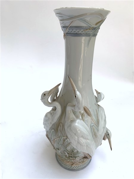 Manifattura di Lladrò. Vaso a bottiglia in porcellana decorata in rilievo a aironi (h. cm 34) (difetti)