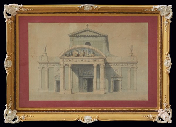 Gaetano Borgo Caratti (secolo XIX) "Progetto per facciata di chiesa" penna, inchiostro bruno e acquerelli (cm 57x83). Firmato in basso a destra. In cornice