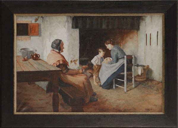 P. Renee "Interno con famiglia" olio su tela (cm 47x70) Firmato in basso a destr
