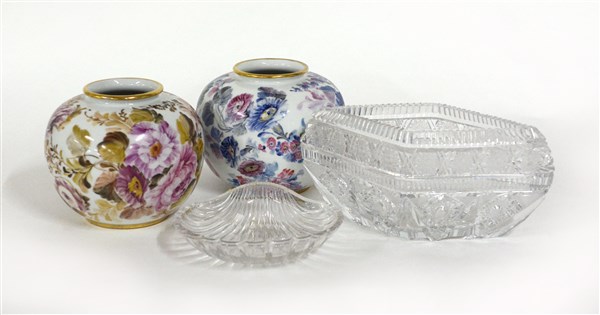 Lotto composto da una coppia di vasi in porcellana decorata a fiori policromi, un posacenere a forma di valva di conchlglia ed un vaso in cristallo (difetti)