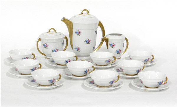 Manifattura di Limoges, secolo XX, parte di servizio da caffe in porcellana decorata in policromia a fiori, profili dorati, composto da: caffettiera, lattiera, zuccheriera e dieci tazze con piattini (difetti)
