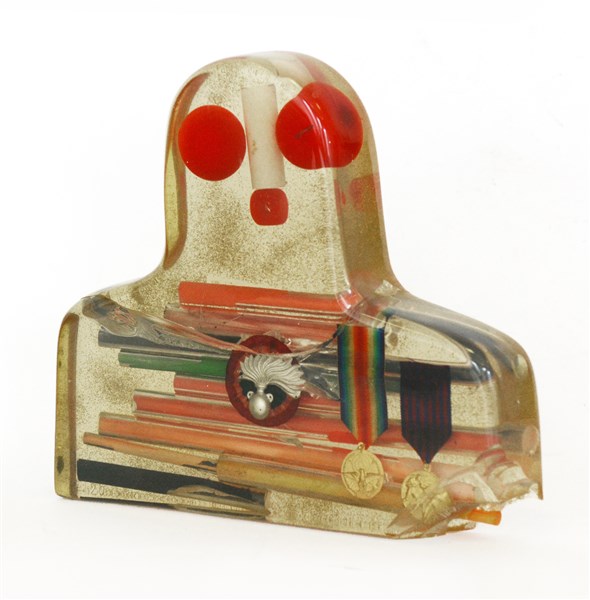Enrico Baj "Personaggio decorato" 1968 scultura in resina con inclusioni in mate