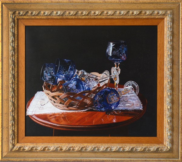Giuseppe Carta "Cesto con pizzo su tavolino" 1997-98 olio su tela cm 55x65. In c