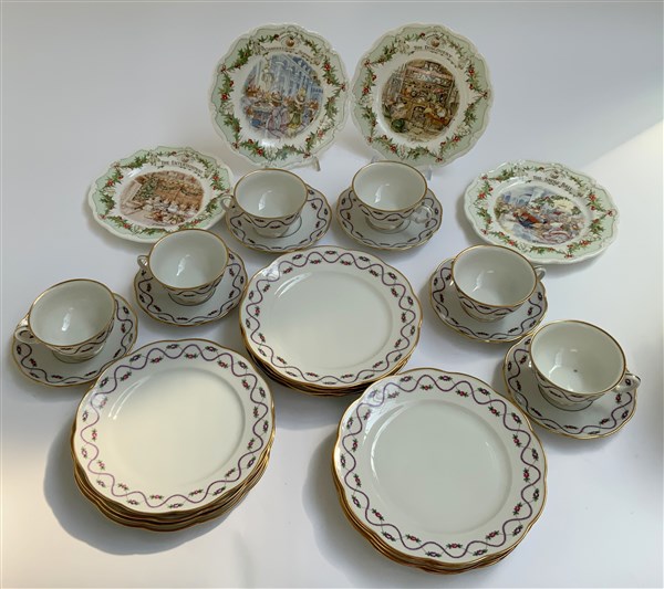 Manifatture diverse. Lotto composto da una parte di servizio in porcellana decorato a fiorellini composto da dodici piattini da dessert e sei tazze da tè con piattini, unito a quattro piatti Royal Doulton in custodie cartonate originali (difetti)