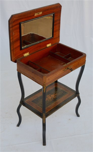 Tavolino da lavoro con piano apribile ebanizatto e filettato in legni vari a fi
