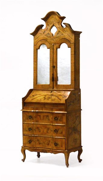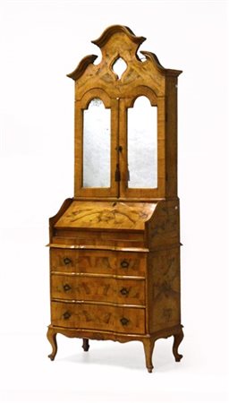 Trumoncino lastronato in noce e radica di noce e filettato, parte superiore a due ante a specchio celanti tre cassettini a vani. Parte inferiore con anta ribaltabile quattro cassettini a sportello, fronte sagomato a tre cassetti, piedi mossi ed intagliati (cm 75x204x41) (difetti)