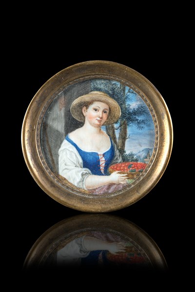 Scuola del secolo XIX "Ritratto di dama con cesto di ciliege" miniatura tonda s