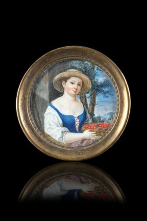 Scuola del secolo XIX "Ritratto di dama con cesto di ciliege" miniatura tonda su avorio (d. cm 4,5) In cornice (difetti)