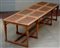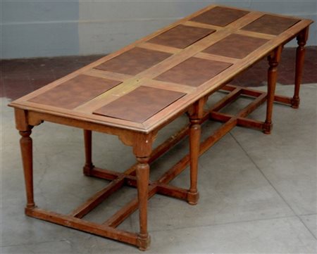 Tavolo da biblioteca di forma rettangolare con otto piani sollevabili in finta pelle, gambe riunite da traversa (cm 300x85x99)(difetti, rotture e mancante di due piedi)