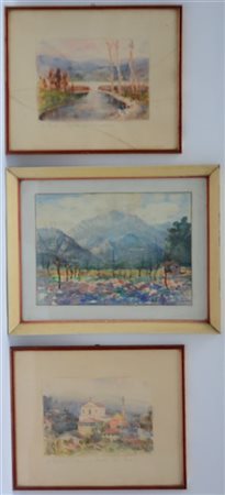 Lotto composto da tre acquerelli su carta raffiguranti "Merate" "Papaveri" e "Resegone, dintorni di Merate, laghetto a Sartirana" firmati in