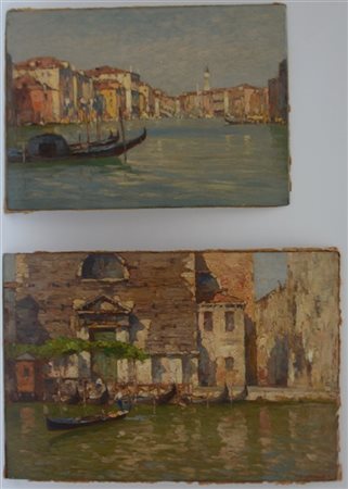 Ignoto del XX Secolo. Lotto composto da due dipinti ad olio su cartone e compensato raffiguranti "Canal Grande a Venezia" e "Traghetto San Marcuola" (misure diverse) Al retro: siglati P.F.