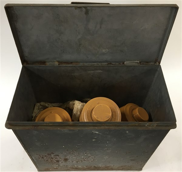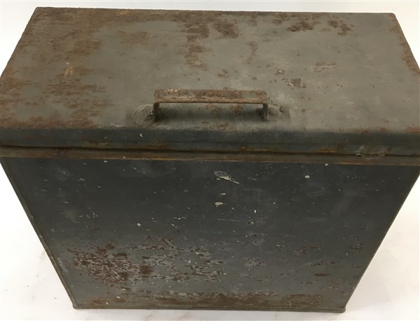 Contenitore metallico con all'interno tre maschere antigas con relativi tre fil