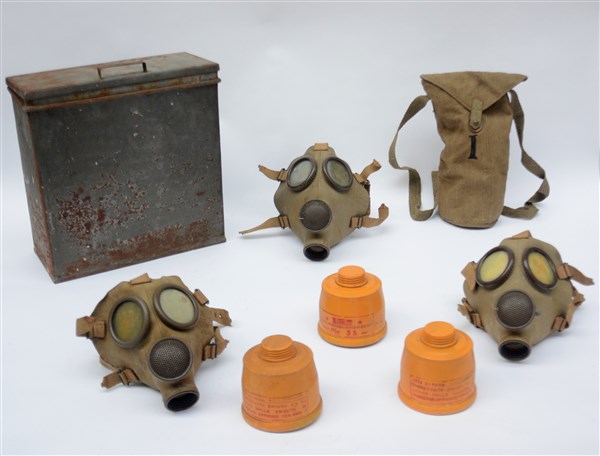 Contenitore metallico con all'interno tre maschere antigas con relativi tre filtri. Italia, 1938, XVI anno dell'era fascista. Produzione Pirelli. (difetti)