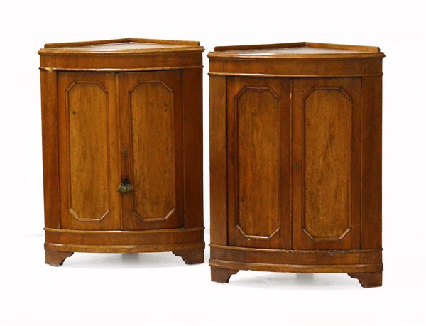 Coppia di angoliere basse in noce a due ante riquadrate, piedi a mensola (cm 48x90x48) (difetti, restauri e mancanze)