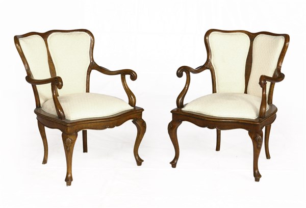 Coppia di poltroncine in legno con schienale bipartito di forma mossa