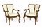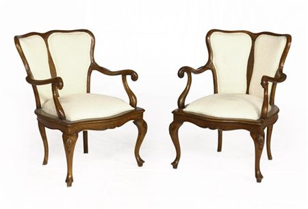 Coppia di poltroncine in legno con schienale bipartito di forma mossa (difetti e restauri)