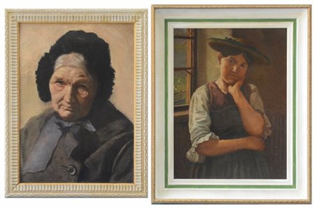 Lotto composto da un dipinto ad olio su panforte copia da Emile Rau (1858-1937) raffigurante "Ritratto di contadina" (cm 43x32) iscritto e datato 1923 ed uno di artista ignoto ad olio su cartone raffigurante "Ritratto di anziana" (cm 46x34) In cornici