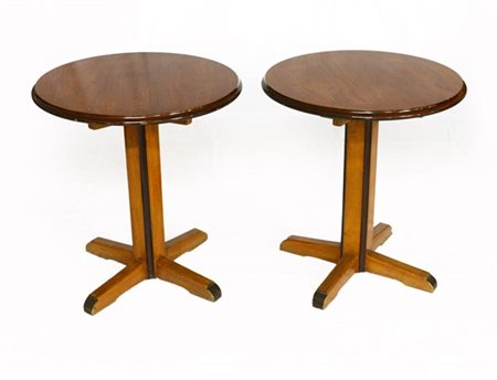 Coppia di tavolini tondi con profili ebanizzati. Gamba centrale squadrata termi