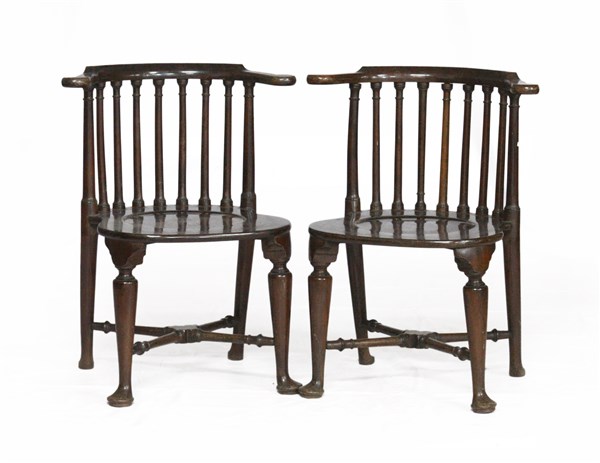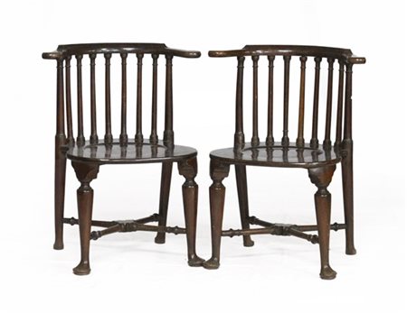 Coppia di poltroncine con schienale curvo decorato da colonnine tornite, gambe riunite da traverse tornite, Inghilterra secolo XX (difetti e restauri)