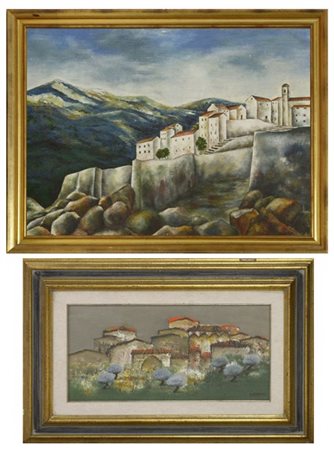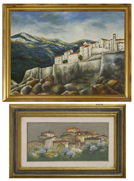 P. Geronimi - Gamboni, lotto di due dipinti ad olio su tela raffiguranti scorci con case, misure diverse, in cornici